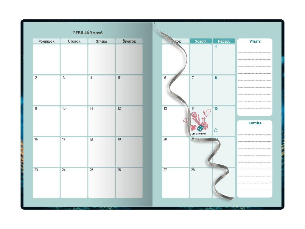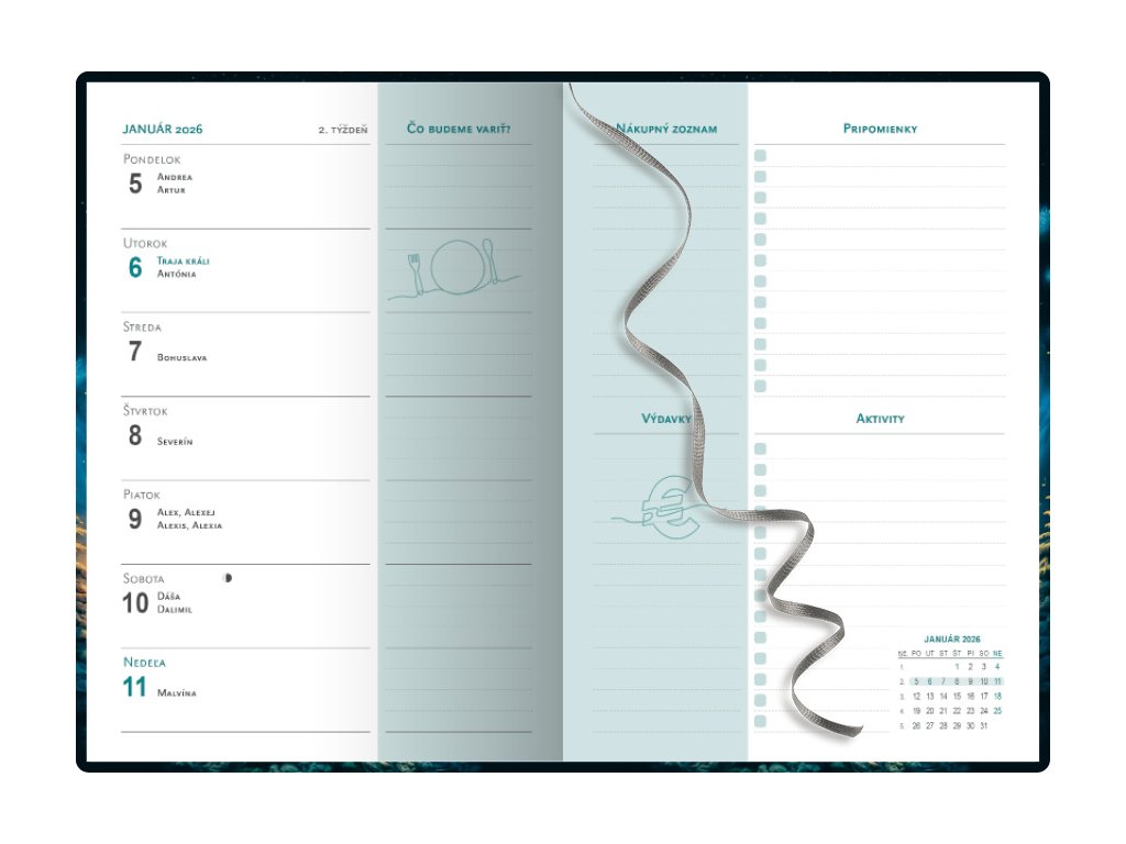 Tento prehľadný týždenný rodinný diár je praktický pomocník pre celú rodinu. Je navrhnutý tak, aby pomohol lepšie organizovať každodenný rodinný život. Umožňuje plánovať spoločné aktivity, výlety, dovolenky, pracovné povinnosti a tiež si môžete naplánovať jedálny lístok na celý týždeň. Obsahuje rozvrh hodín, chutné recepty, prehľad aktivít. Obal diára je v tvrdých doskách so soft touch laminom, medenou razbou. Všetky bočné plochy diára sú potlačené farebne.FORMAT | 142 x 204 |