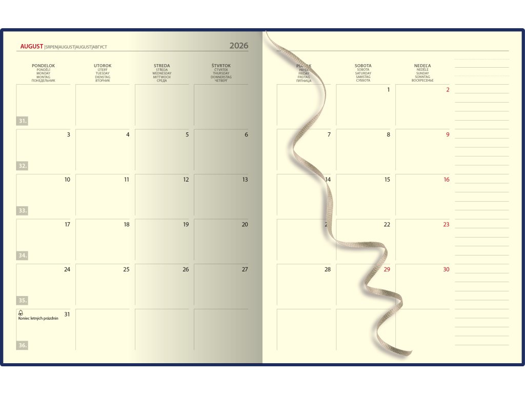 Luxusný týždenný diár potiahnutý kvalitným termocitlivým poťahom s prehľadným kalendáriom na celý týždeň. Diár je v pevnej väzbe s prednou aj zadnou penovou doskou, doplnený ozdobným prešitím cez 1/5 diára a dvoma lacetkami. Štítok z ekologickej kože s vyrazeným rokom. Obsahuje slovenské kalendárium.FORMAT | 202 x 260 |