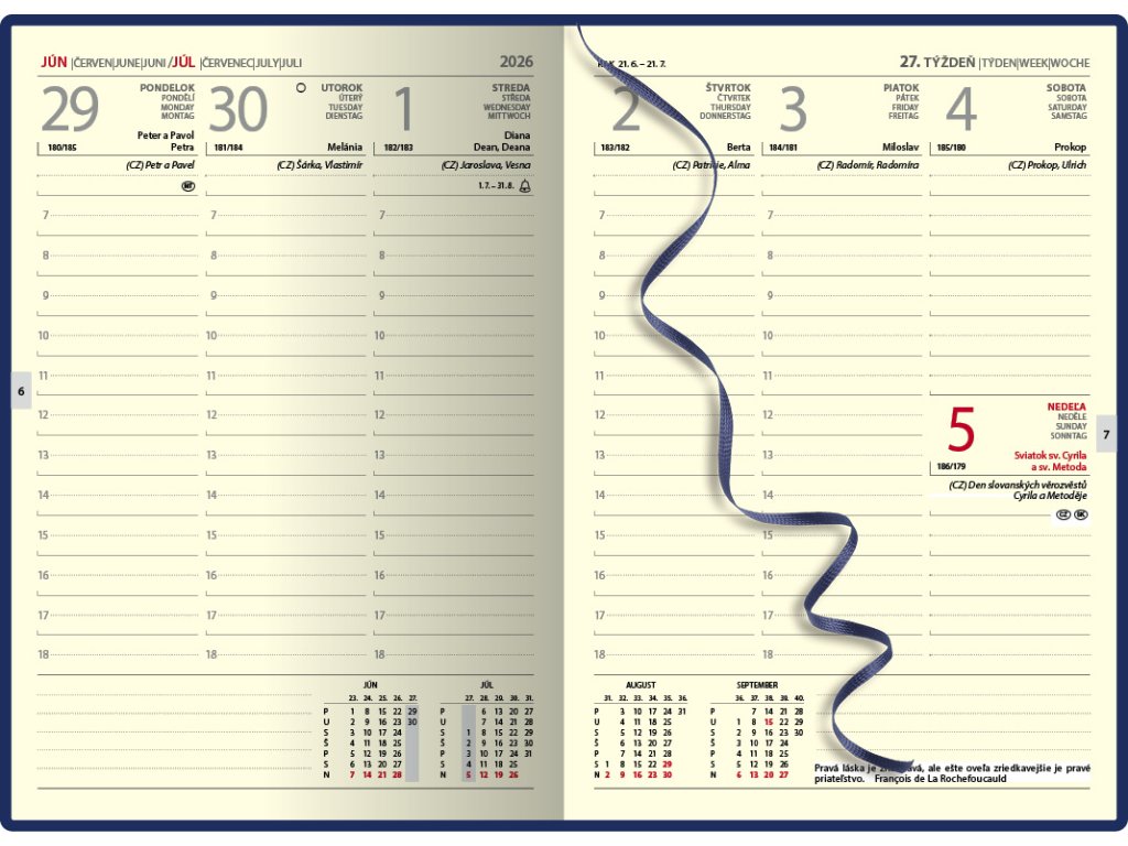 Manažérsky týždenný diár s prehľadným kalendáriom na každý týždeň. Diár je v pevnej väzbe s prednou penovou doskou, jednoduchý dizajn dopĺňa strieborná razba roku. Obsahuje slovenské kalendárium.FORMAT | 170 x 240 |