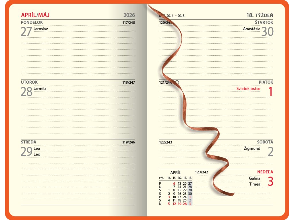 Štýlový týždenný mini diár v pestrej farbe s prehľadným kalendáriom na celý týždeň. Diár má praktickú flexi väzbu. Stredom diára je gumička prichytená o kovový úchyt. Obsahuje slovenské kalendárium.FORMAT | 92 x 142 |