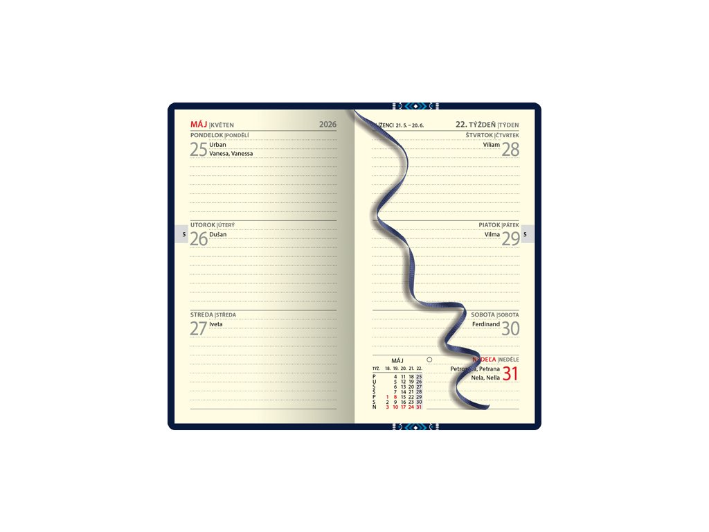 Mini týždenný diár má oderuvzdorný povrch s motívom folklórnej stuhy. Efektná razba fóliou a 3D lak vytvárajú dokonalý dizajn. Obsahuje slovenské kalendárium.FORMAT | 80 x 140 |