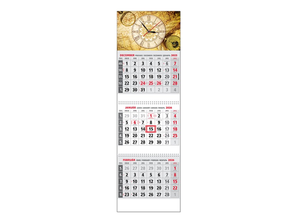 Trojdielny kalendár s menami v SK + CZ, názvy mesiacov a dní v SK, CZ, EN, DE a RU. Hodinky QP| FORMAT | 295 x 925 |