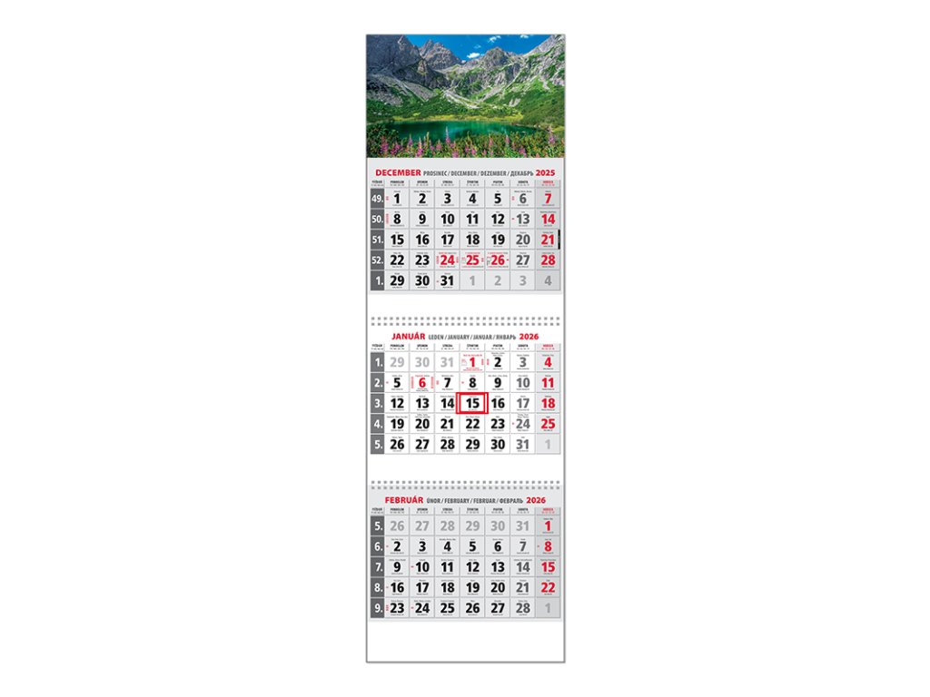 Trojdielny kalendár s menami v SK + CZ, názvy mesiacov a dní v SK, CZ, EN, DE a RU. Obrázok AFORMAT | 295 x 925 |