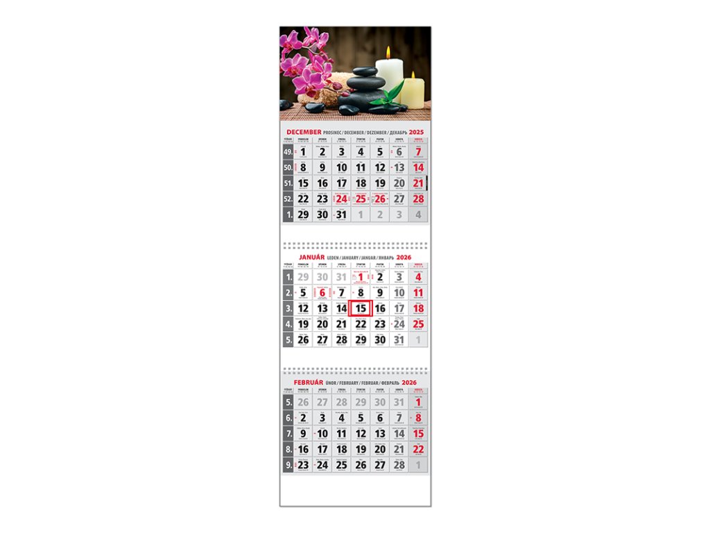 Trojdielny kalendár s menami v SK + CZ, názvy mesiacov a dní v SK, CZ, EN, DE a RU. Obrázok GFORMAT | 295 x 925 |