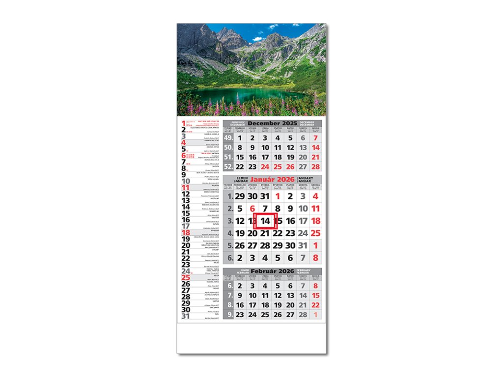 Plánovací 3-mesačný sivý kalendár s priloženou hornou čistou lištou, s menami v SK + CZ, názvy mesiacov a dní v SK, CZ, UK, DE a HU. Obrázok AFORMAT | 295 x 663 |