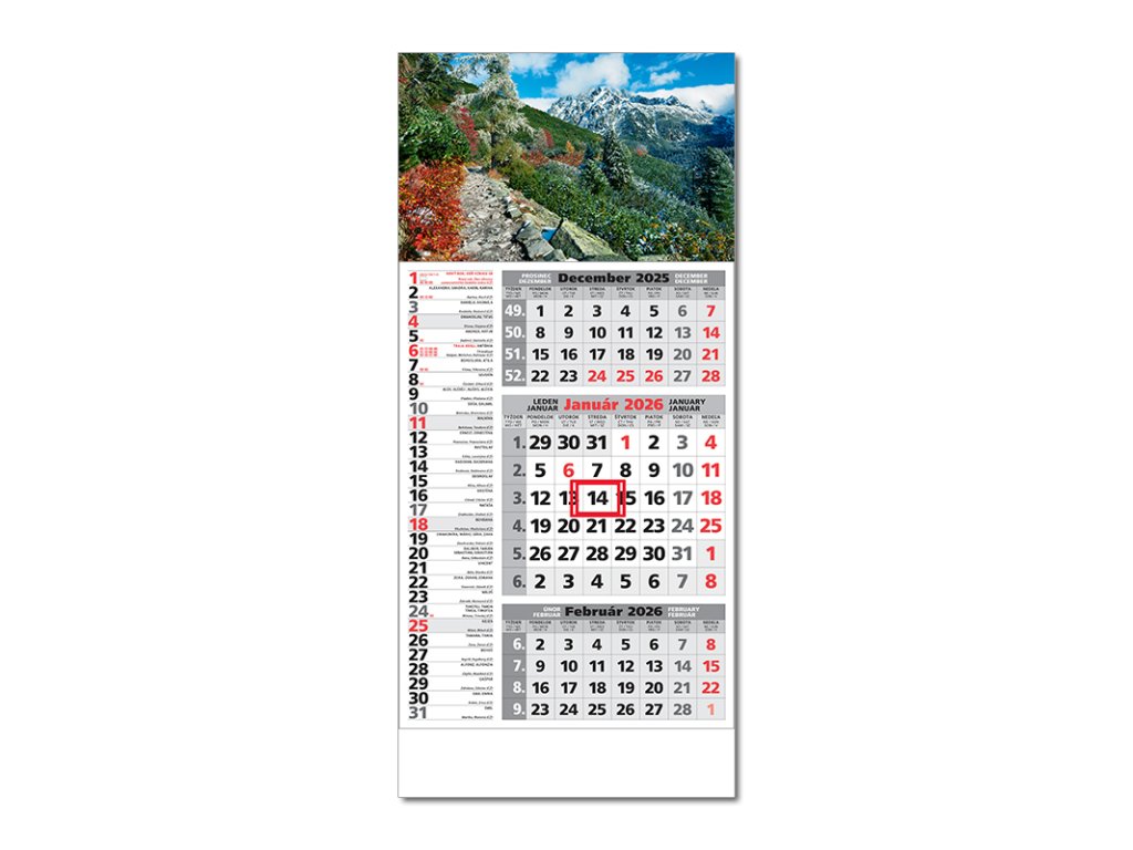 Plánovací 3-mesačný sivý kalendár s priloženou hornou čistou lištou, s menami v SK + CZ, názvy mesiacov a dní v SK, CZ, UK, DE a HU. Obrázok HFORMAT | 295 x 663 |
