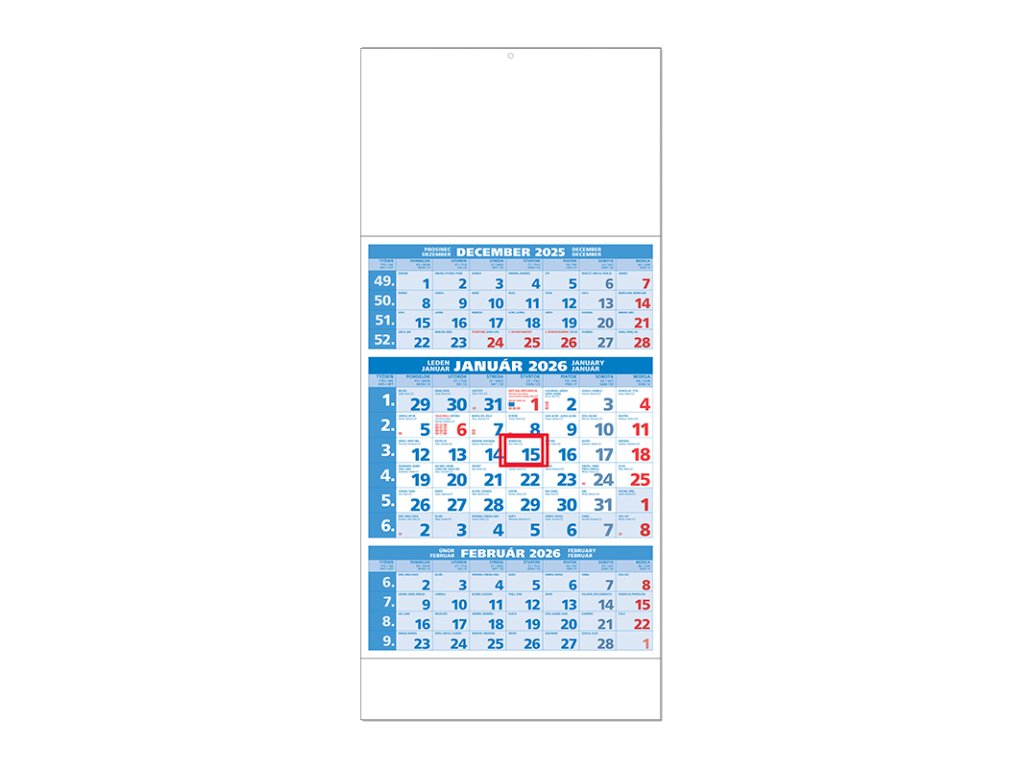 Plánovací 3-mesačný modrý kalendár s priloženou hornou čistou lištou, s menami v SK + CZ, názvy mesiacov a dní v SK, CZ, UK, DE a HU. . Možnosť výberu obrázku.FORMAT | 295 x 663 |