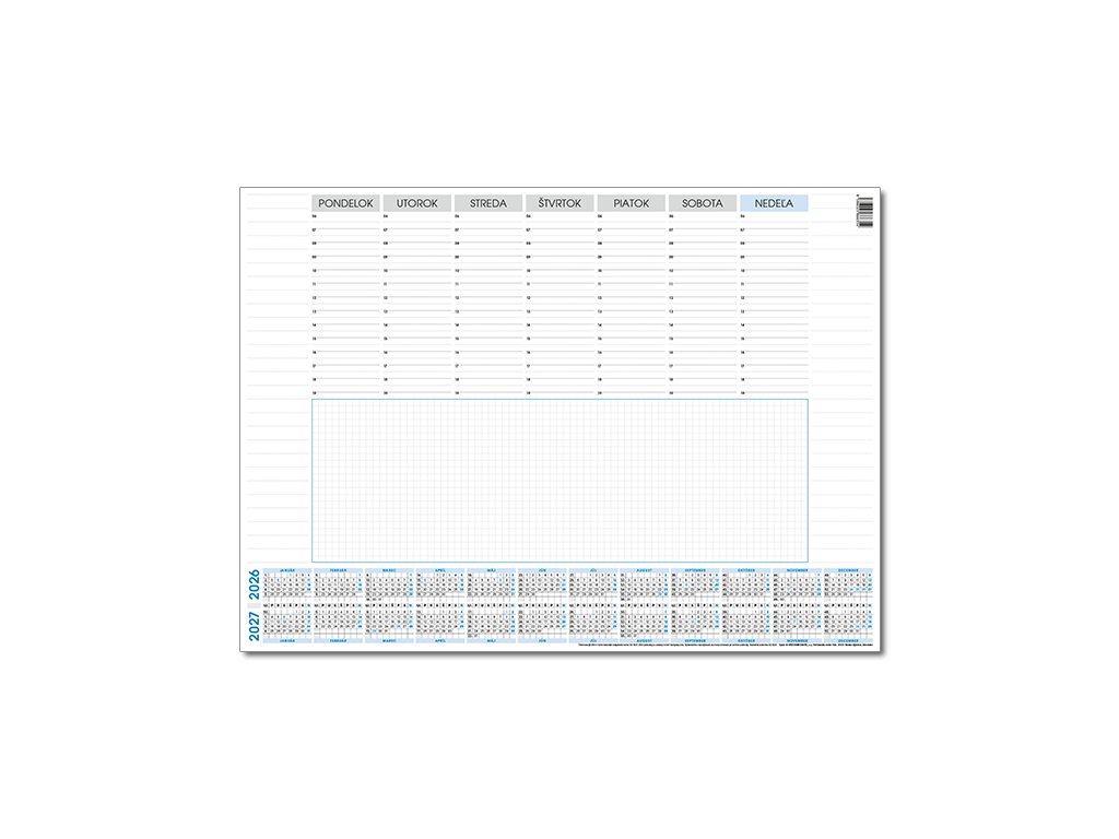 Ideálny doplnok na každý pracovný stôl! Podložka obsahuje týždenné kalendárium určené na zapisovanie jednotlivých poznámok v konkrétnom dni. V dolnej časti nájdete prehľadné dvojročné kalendárium na roky 2026 a 2027, vďaka ktorému máte všetky dôležité dátumy vždy poruke. Podložka je doplnená o transparentnú plastovú spodnú lištu, ktorá je ideálna na reklamnú potlač. Vhodná pre firmy ako praktický a zároveň reprezentatívny darček. Transparentná lišta v rozmere 470x65mm.| FORMAT | 470 x 340 |