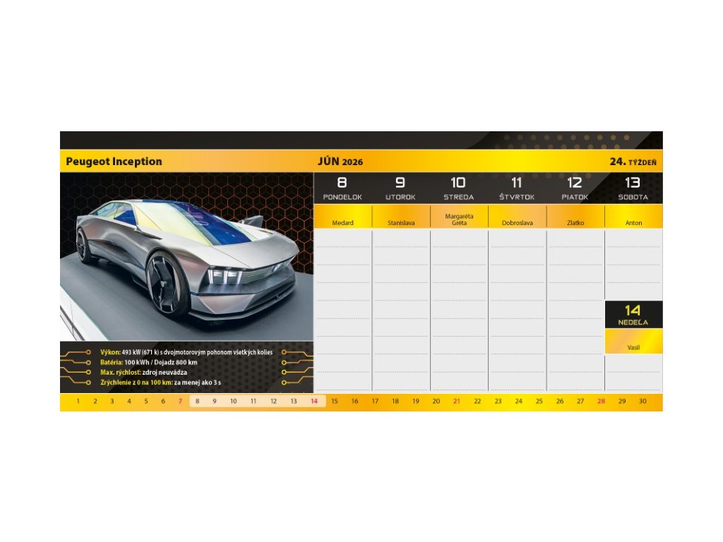 Skvelý kalendár pre všetkých milovníkov áut! Jedinečná povrchová úprava obálky s metalickým efektom kalendára spolu s pútavými novinkami zo sveta automobilov zaručene poteší každého automobilového nadšenca. Doplnený o stručný popis vozidla, jeho zaujímavosti a technické údaje.FORMAT | 297 x 138 |