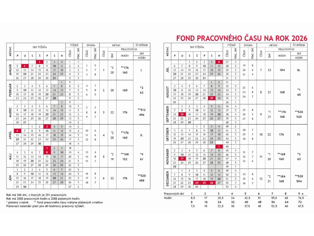 Pracovný týždenný kalendár s pranostikami. Riadkové kalendárium. Obsahuje dane, fond pracovného času, sviatky v EU, východy a západy slnka, fázy mesiaca.