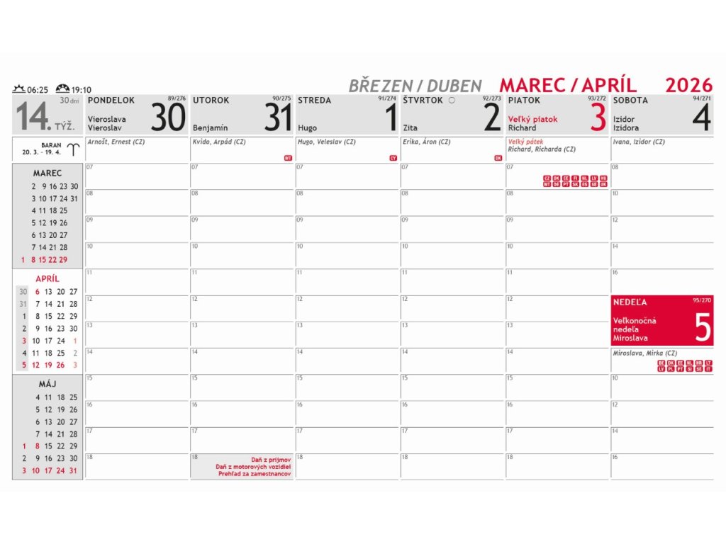 Praktický plánovací kalendár s prehľadom najbližších mesiacov na ľavej strane. Dostatok miesta na plánovanie celého týždňa. Obsahuje dane, fond pracovného času, sviatky v EU,...