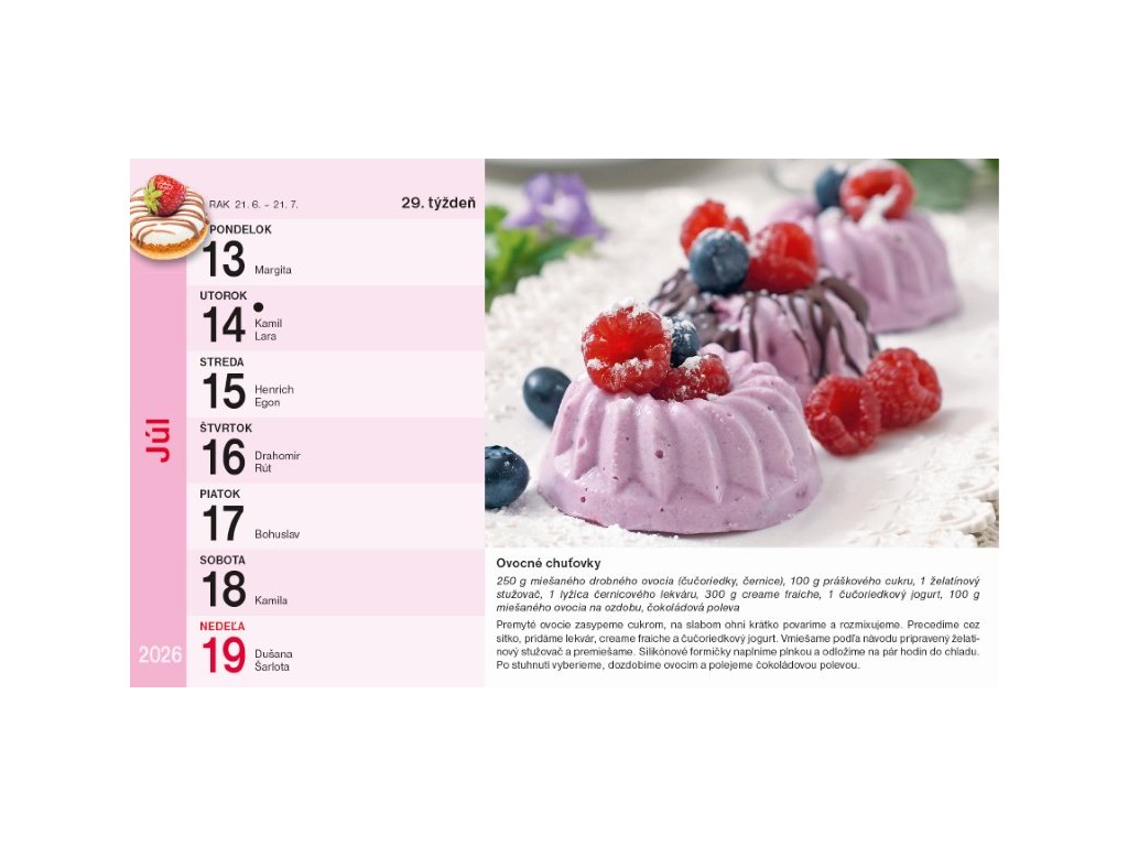 Sladká inšpirácia na celý rok! Tento týždenný stolový kalendár ponúka overené recepty na chutné múčniky a domáce dezerty, ktoré si obľúbite na prvé ochutnanie. Každý týždeň nájdete nový recept doplnený o lákavú fotografiu výsledného múčnika, ktorá vám určite navodí chuť pustiť sa do pečenia.FORMAT | 230 x 140 |