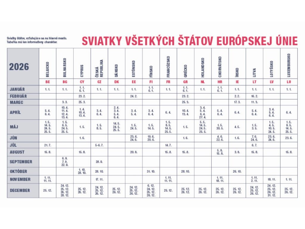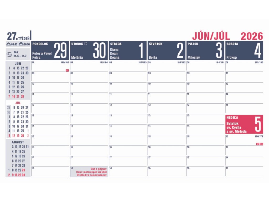 Pracovný týždenný kalendár. Stĺpcové kalendárium. Obsahuje dane, fond pracovného času, sviatky v EU, východy a západy slnka, fázy mesiaca.FORMAT | 230 x 140 |