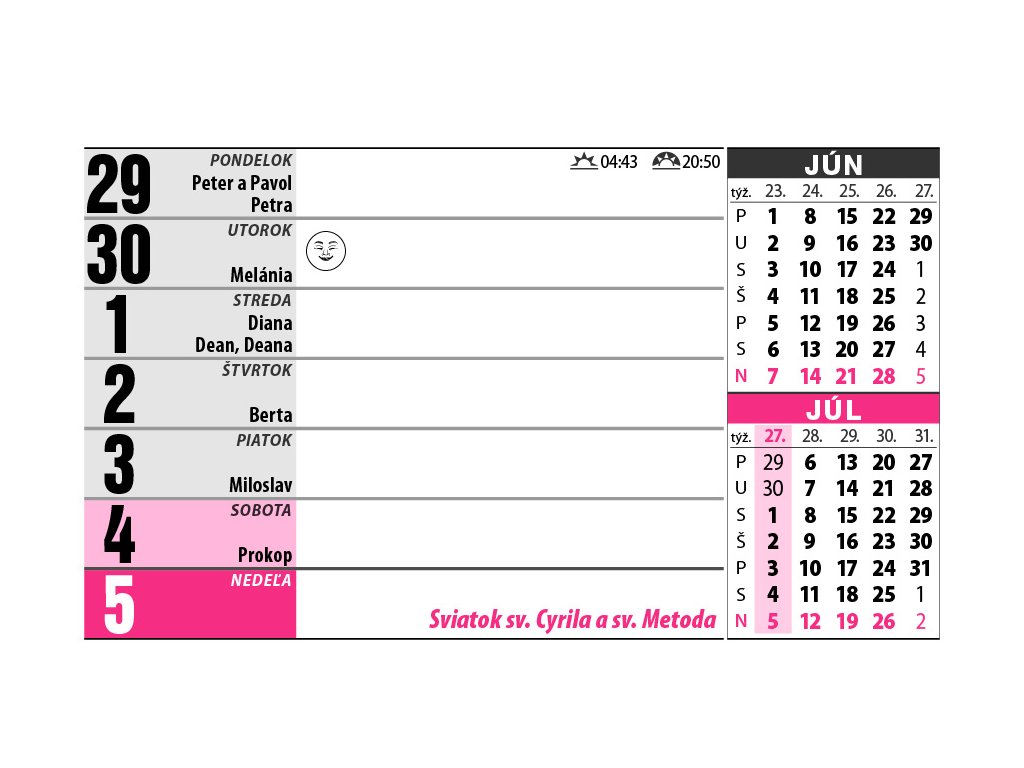 Tento týždenný riadkový kalendár ocenia najmä seniori a ľudia so zhoršeným zrakom. Veľké, ľahko čitateľné písmo zaručuje pohodlné používanie bez námahy. Obsahuje tabuľku prázdnin, slovenský menný kalendár a priestor na. Ideálny pomocník do domácnosti, kancelárieFORMAT | 230 x 140 |
