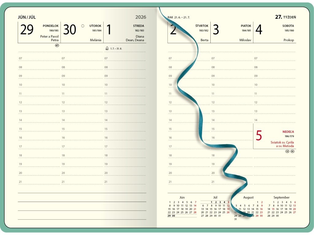Jedinečný týždenný diár potiahnutý kvalitným termocitlivým poťahom. Diár je v pevnej väzbe s prednou penovou doskou, farebnou gumičkou, pútkom na pero a praktickým vreckom. Slovenské prehľadné kalendárium.| FORMAT | 138 x 205 |
