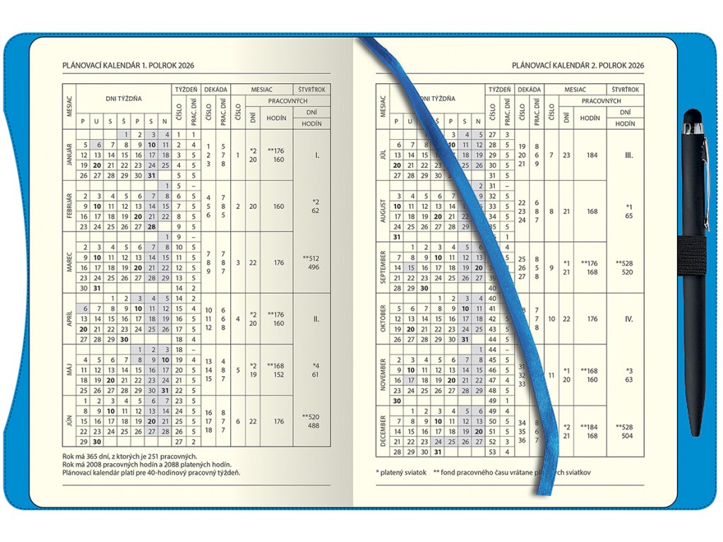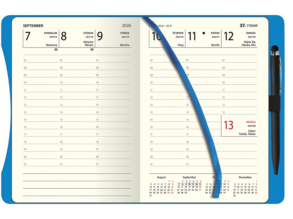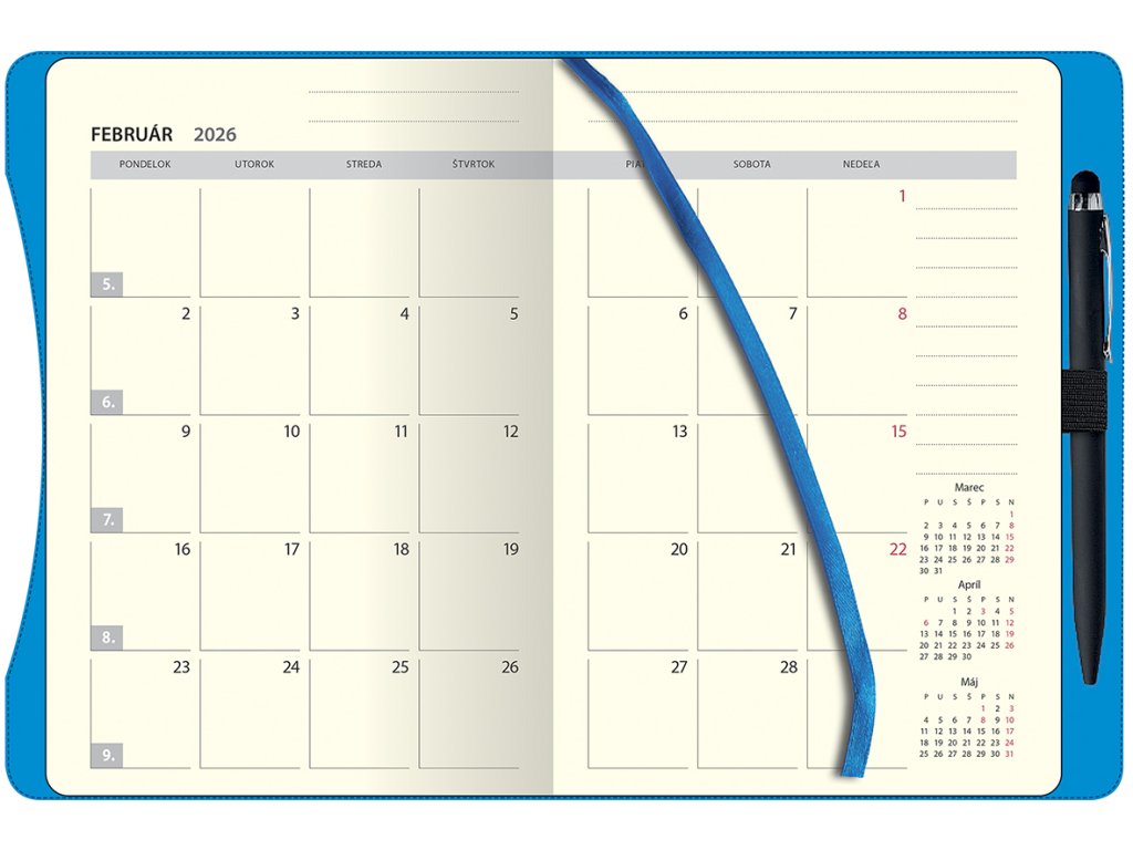 Obľúbený týždenný stĺpcový diár s prehľadným kalendáriom na každý týždeň s pútkom a vloženým perom. Diár je v pevnej väzbe z pogumovaného poťahu s razbou roka. Obsahuje slovenské kalendárium.| FORMAT | 138 x 205 |