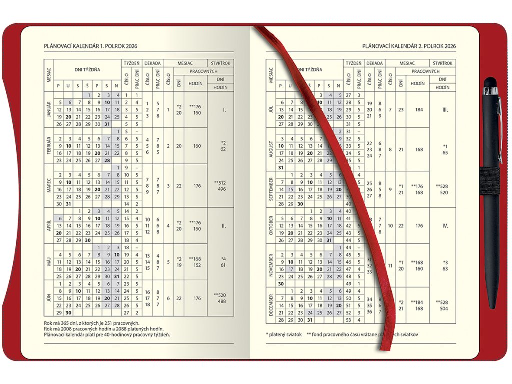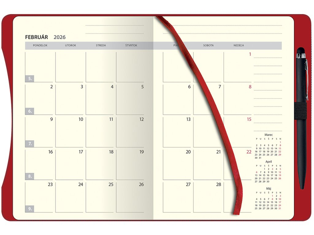 Obľúbený týždenný stĺpcový diár s prehľadným kalendáriom na každý týždeň s pútkom a vloženým perom. Diár je v pevnej väzbe z pogumovaného poťahu s razbou roka. Obsahuje slovenské kalendárium.| FORMAT | 138 x 205 |