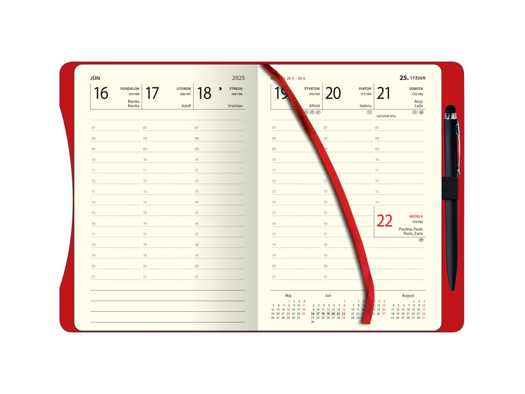 Obľúbený týždenný stĺpcový diár s prehľadným kalendáriom na každý týždeň s pútkom a vloženým perom. Diár je v pevnej väzbe z pogumovaného poťahu s razbou roka. Obsahuje slovenské kalendárium.| FORMAT | 138 x 205 |